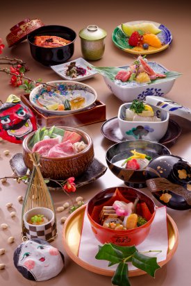 創業310年を迎える京懐石の老舗であり、四季折々の旬の食材を使用し、その時の季節にあった調理法で本格的な京懐石をご用意しております。今月は『常陸牛吉兵衛鍋』『とらふぐたたき』など、最後のお食事には名物の『うなぎ御飯』のご用意をしております。