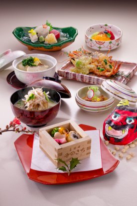 『蟹と春野菜の揚物』を始めとして、『名物鯉こく汁』、『福豆ひじき御飯』などの懐石コースです。